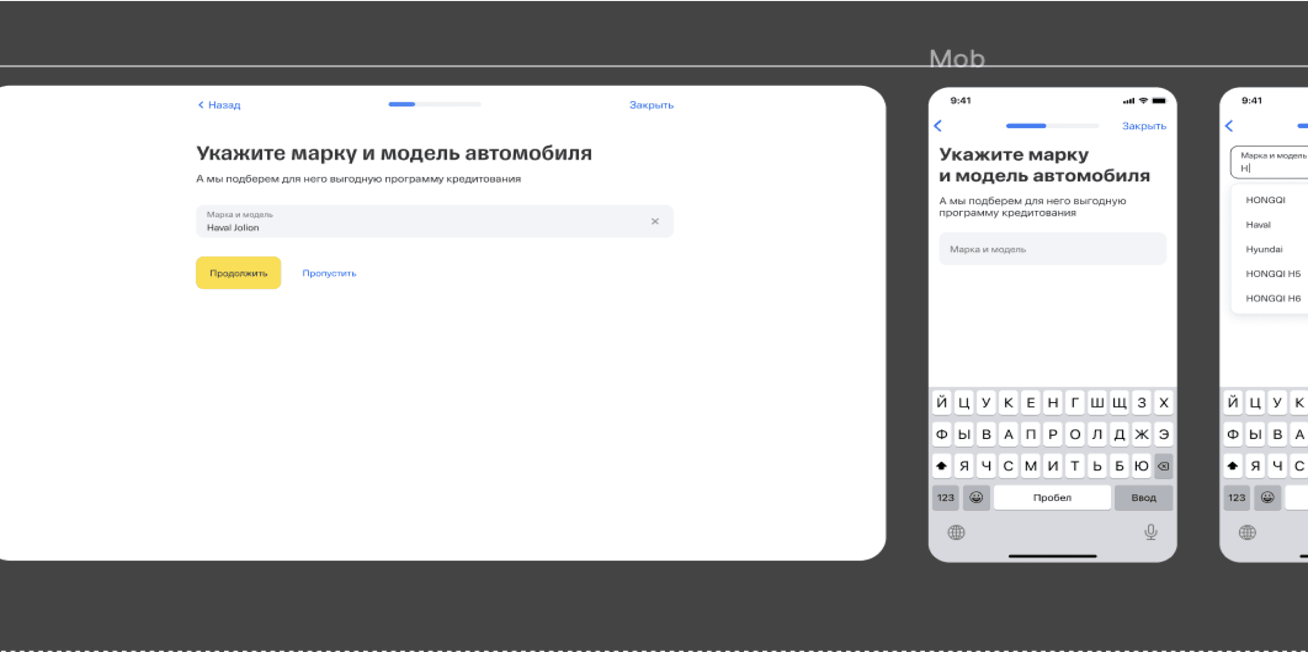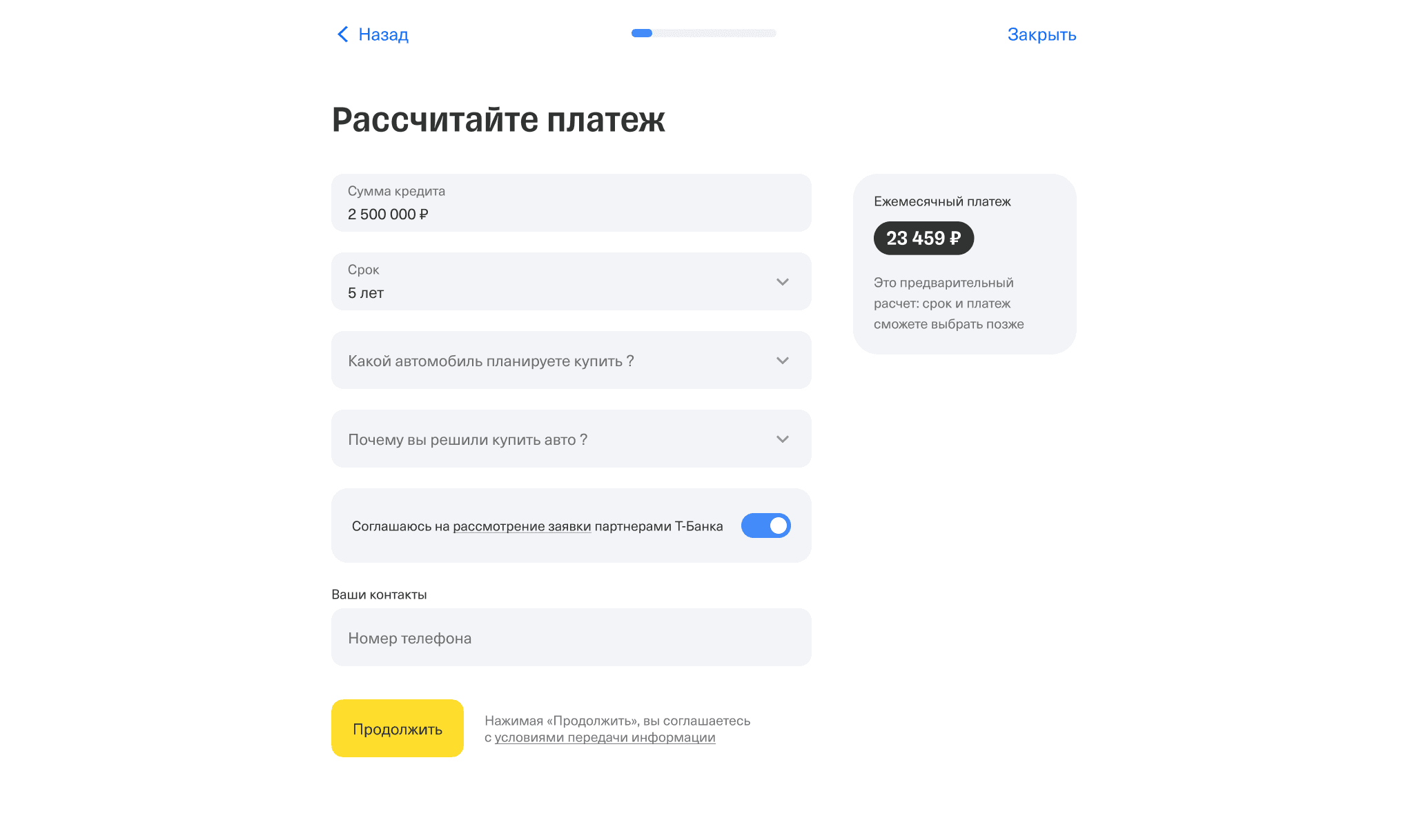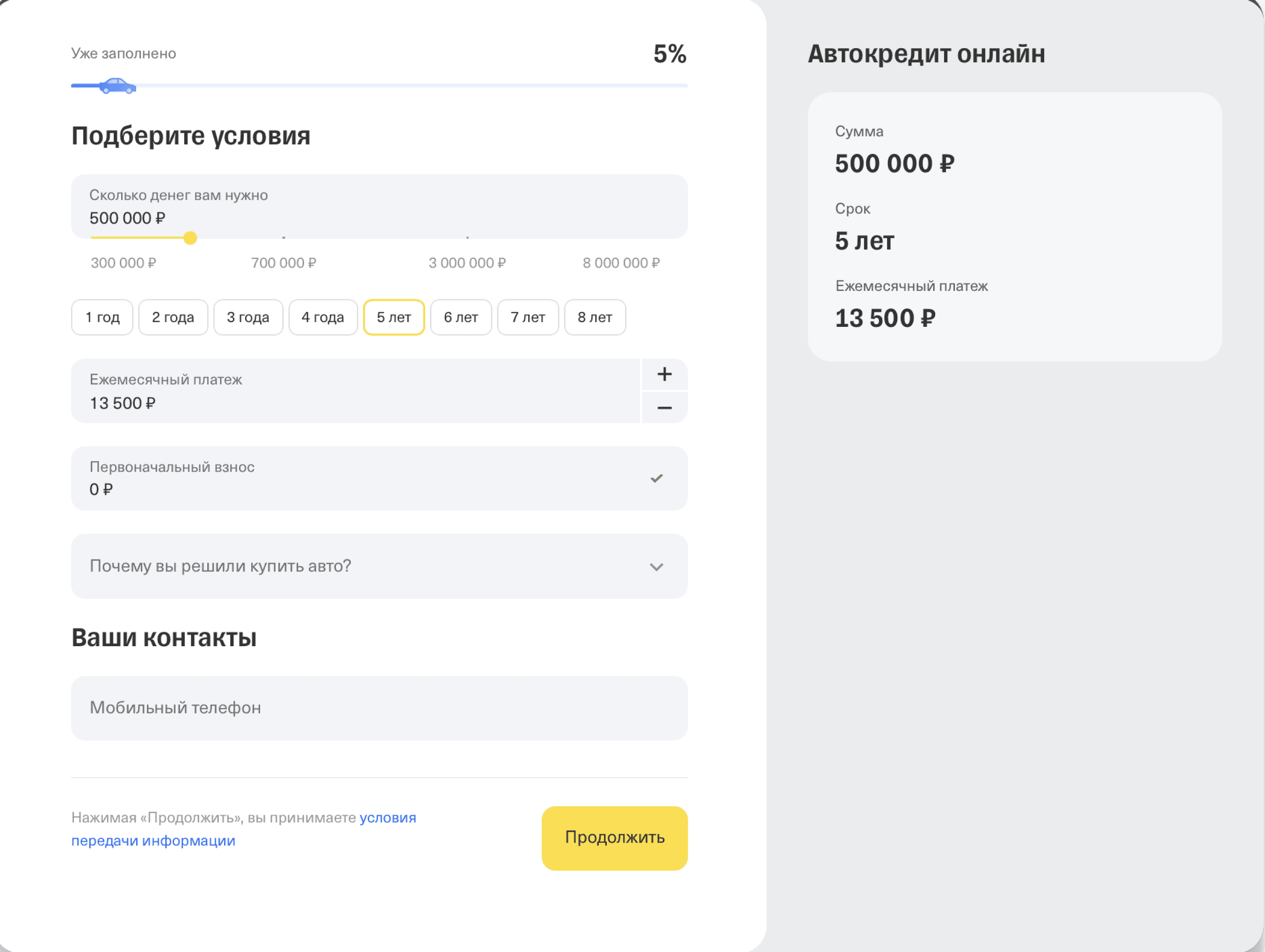 Обновленный флоу находится в разработке. Запланированы A/B тесты новых полей (например, первоначального взноса)